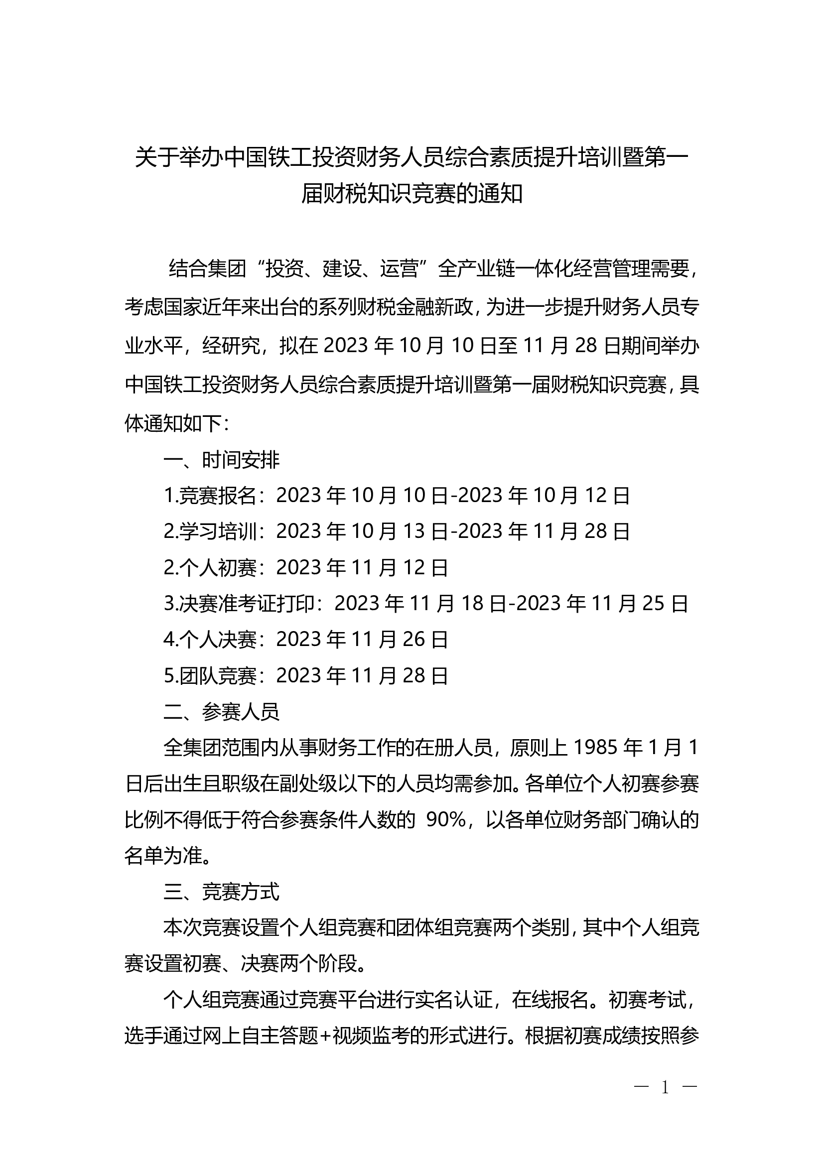 關于舉辦中國鐵工投資財務人員綜合素質提升培訓暨第一屆財稅知識競賽的通知