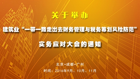 企業面臨了解不同項目所在地東道國的政策法規,做好財務風險管控,架構融資及利潤的分配,處理復雜的境外所得抵免及增值稅退稅,最終實現企業價值最大化等諸多迫切需要解決的難題。為幫助建筑企業在一帶一路“走出去”新機遇下解決面臨的財稅風險難題,茲決定舉辦“建筑業一帶一路走出去財務管理與稅務籌劃風險防范實務應對大會”。