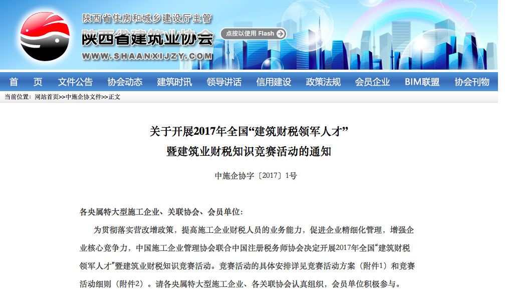 【陜西省建筑業協會】關于開展2017年全國“建筑財稅領軍人才” 暨建筑業財稅知識競賽活動的通知