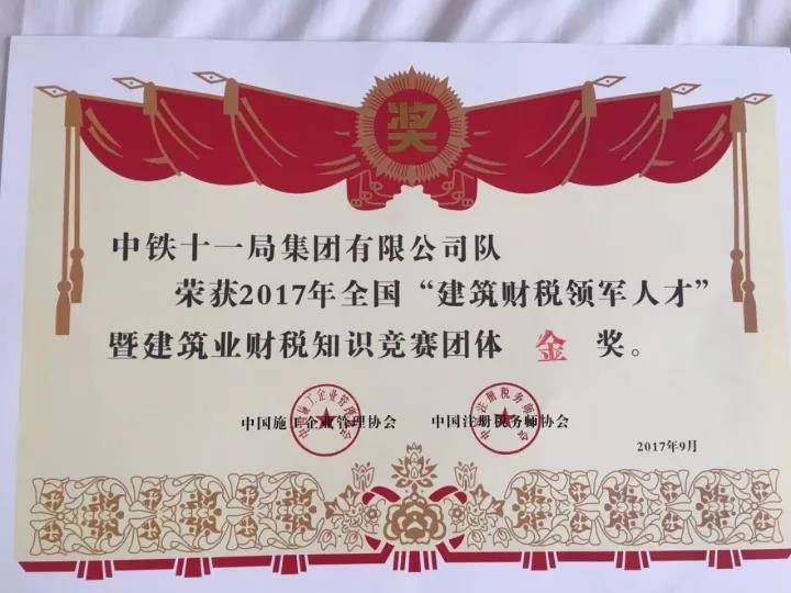 2017年9月23日-24日,中國(guó)施工企業(yè)管理協(xié)會(huì)和中國(guó)注冊(cè)稅務(wù)師協(xié)會(huì)聯(lián)合舉辦的“天揚(yáng)杯”2017年全國(guó)建筑業(yè)財(cái)稅知識(shí)競(jìng)賽在北京首都經(jīng)貿(mào)大學(xué)舉行,中鐵十一局奪得團(tuán)體賽金獎(jiǎng),在全國(guó)10個(gè)金獎(jiǎng)團(tuán)隊(duì)中排名第四,同時(shí)在個(gè)人賽中奪得1枚金獎(jiǎng)、2枚銀獎(jiǎng)、6枚銅獎(jiǎng)。
