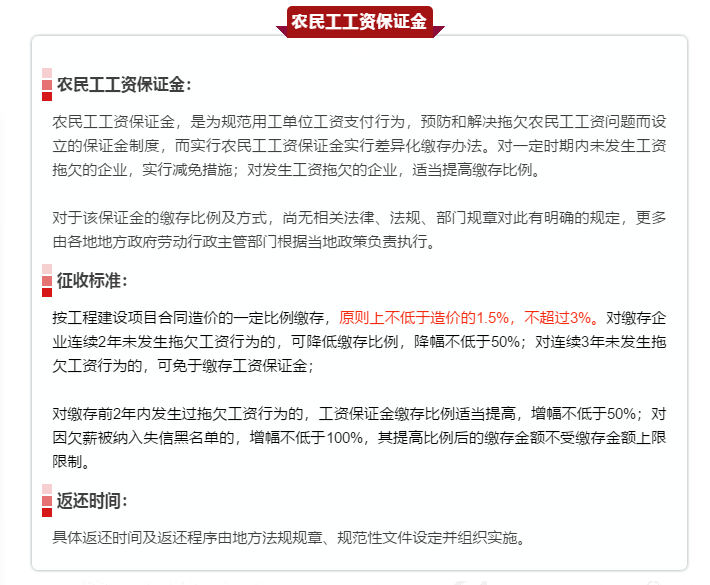? 除保留依法依規設立的農民工工資、投標、履約、工程質量4項保證金外,其他保證金一律取消。已收取的要于當年底前退還。