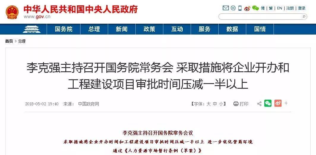 國務院總理李克強5月2日主持召開國務院常務會議,采取措施將企業開辦時間和工程建設項目審批時間壓減一半以上,進一步優化營商環境;通過《人力資源市場暫行條例(草案)》。