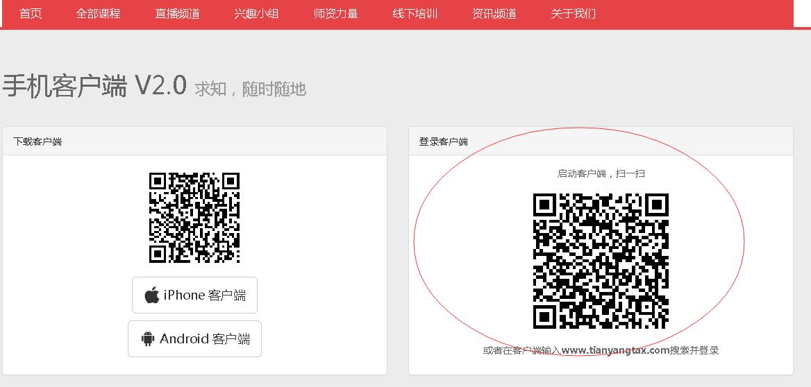 二、網校首頁右下角找到手機客戶端的標識(紅色圈框部分),并點擊(或者在登錄網校后在網址欄直接輸入http://www.tianyangtax.com/mobile/)。