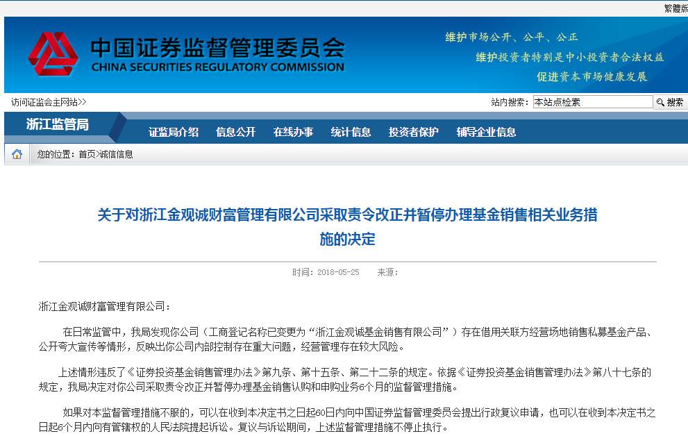 ? ? ? 上面也說了,2018年5月22日,浙江證監(jiān)局正式發(fā)布《 關(guān)于對(duì)浙江金觀誠(chéng)財(cái)富管理有限公司采取責(zé)令整改并暫停辦理基金銷售相關(guān)業(yè)務(wù)措施的決定》,明確指出涉事企業(yè)“存在借用關(guān)聯(lián)方經(jīng)營(yíng)場(chǎng)地銷售私募基金產(chǎn)品、公開夸大宣傳等情形,反映出你公司內(nèi)部控制存在重大問題,經(jīng)營(yíng)管理存在較大風(fēng)險(xiǎn)”。