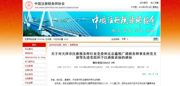 關于對天津市注冊稅務師行業黨委和北京鑫稅廣通稅務師事務所黨支部等先進黨組織予以通報表揚的通知