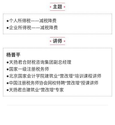 天揚君合財稅咨詢集團副總經理、國家一級注冊稅務師北京國家會計學院建筑業“營改增”培訓課程講師、中國注冊稅務師協會網校特聘“營改增”授課講師、天揚君合建筑業“營改增”專家。