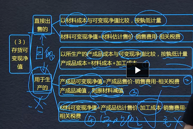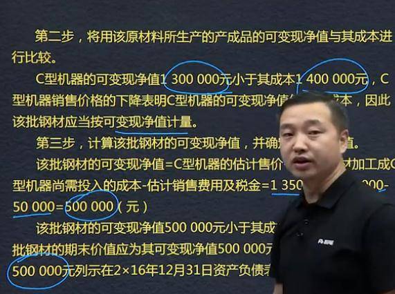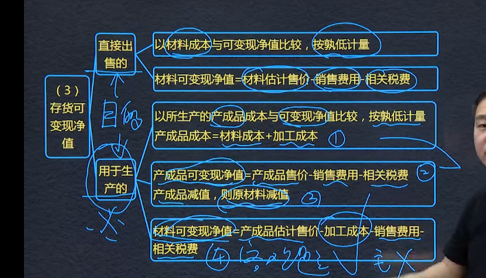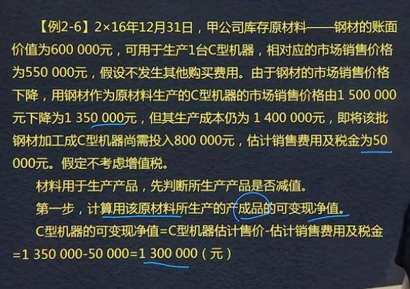 1、存貨可變現凈值:a、直接出售的,材料可變現凈值=材料估計售價-銷售費用-相關稅費;b、用于生產的,產成品可變現凈值=產成品售價-銷售費用-相關稅費。產成品減值,則原材料減值。
