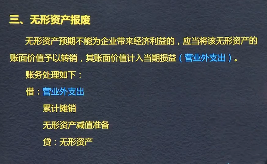 無形資產預期不能為企業帶來未來經濟利益的,應當將該無形資產的賬面價值予以轉銷,其賬面價值轉作當期損益(營業外支出)。